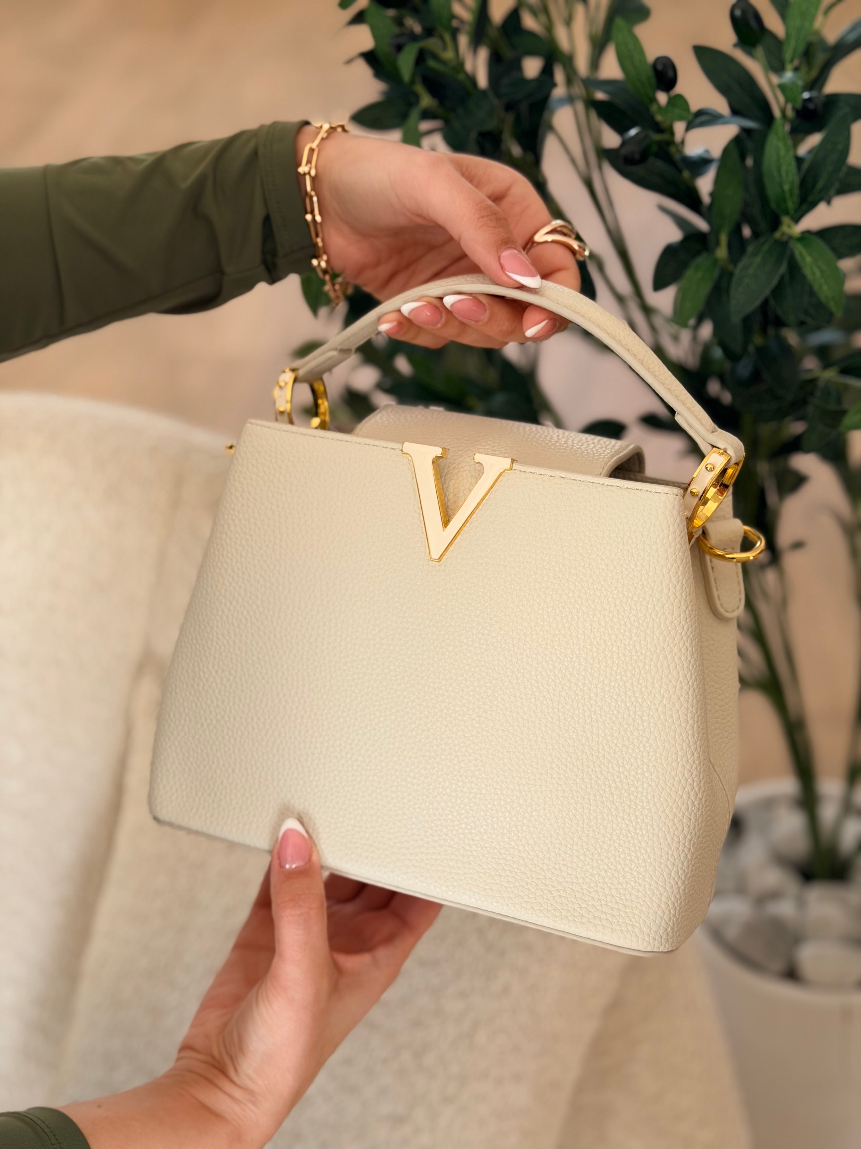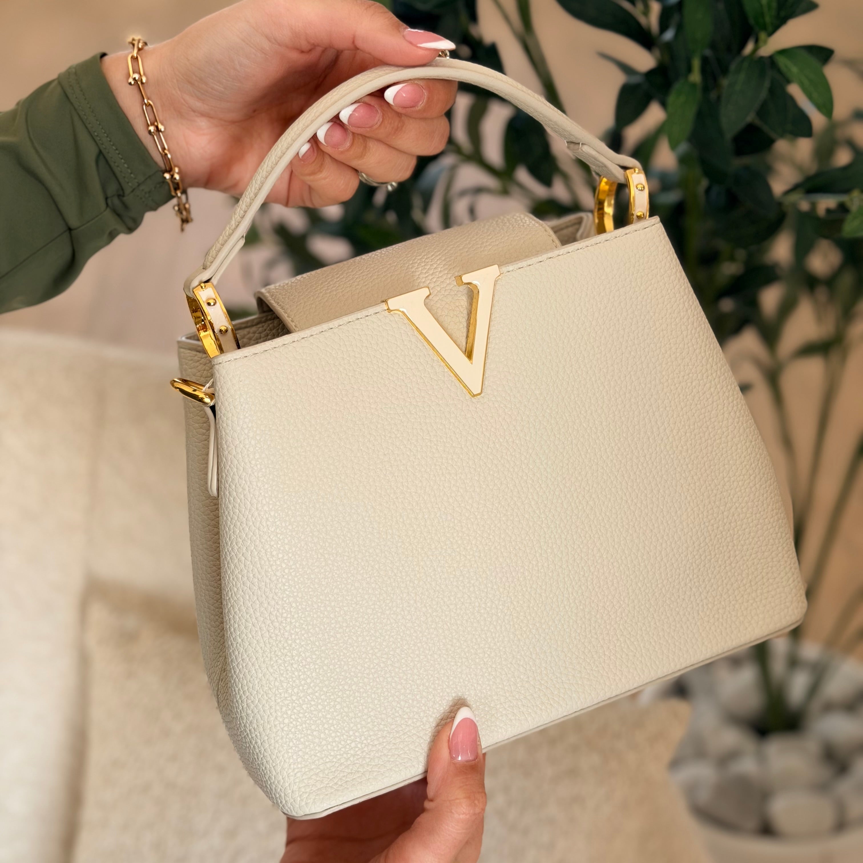 Sac à main chic et structuré, parfait pour un look habillé et raffiné. Son détail métallique en V doré apporte une touche luxueuse et moderne.